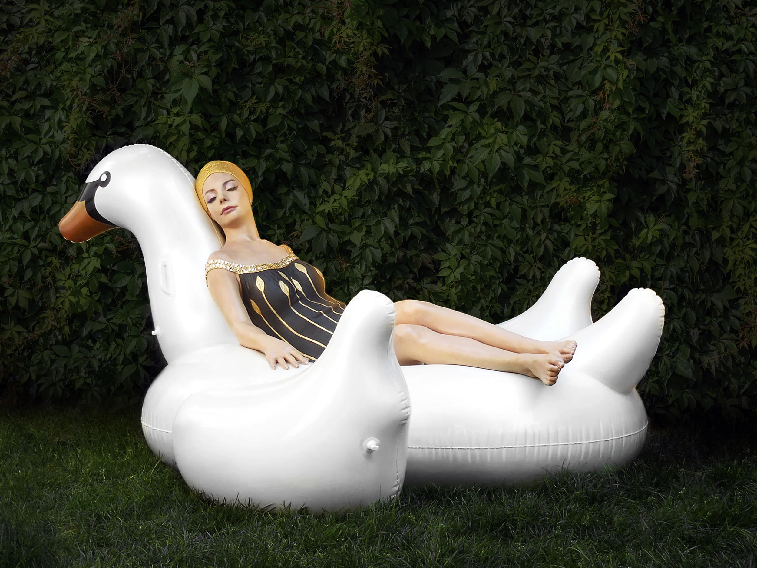 Leda and the Swan draws on mythical context. It is based on the Greek myth in which Zeus, disguised as a swan, seduces Leda, resulting in the birth of Helen of Troy. The reclining female figure drapes her relaxed body across the back of the inflatable swan in an elegant curve that moves from the swan’s neck to its tail. She is simultaneously strong and serene in a vintage women’s bathing suit and swim cap. When the Swan left my NYC studio, the combined weight of the sculpture and its crate was over 1,000 pounds.